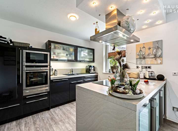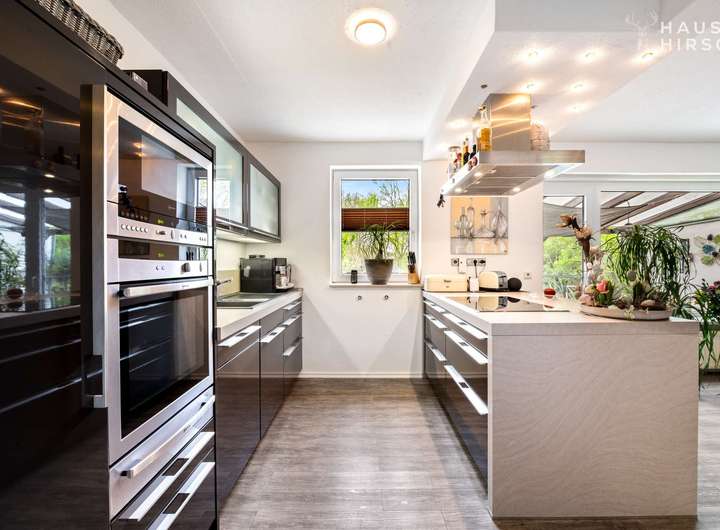 Eine moderne Einbauküche mit hochwertigen Markengeräte (u. a. Induktionskochfeld, Geschirrspüler, integrierter Warmhalteplatte) und eleganten Fronten in Hochglanz ist Teil dieses schönen Hauses.