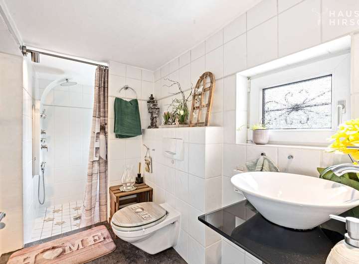Ein separater Bereich mit großer, begehbarer Dusche und WC sorgt daftür, dass auch morgens kein Stress aufkommt.