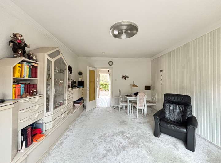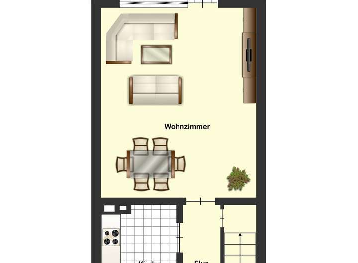 Neben dem Hauseingangsflur befinden sich im Erdgeschoss die Küche und der Wohn- u. Essbereich. Von hier gelangen Sie auf die sonnige Terrasse mit angrenzendem Garten. Die Küche verfügt über ein einfaches Einbauprogramm.
