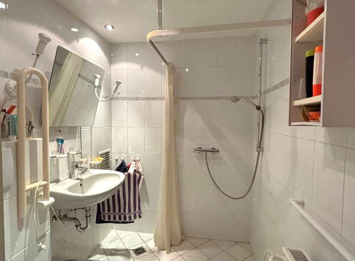 Im Obergeschoss (ohne Schrägen) befindet sich ein Schlafzimmer, das innenliegende Bad sowie ein weiteres Zimmer, welches sich gut als Kinder- oder Arbeitszimmer eignet. Der Sanitärbereich ist rundum hell gekachelt und als Duschbad, mit bodengleicher