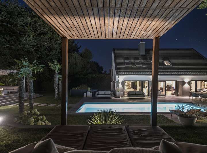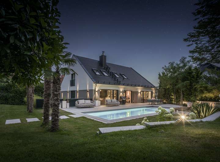_über App ansteuerbares Licht-Konzept im Außenbereich für maximale Wohlfühl-Atmosphäre auch bei Nacht.