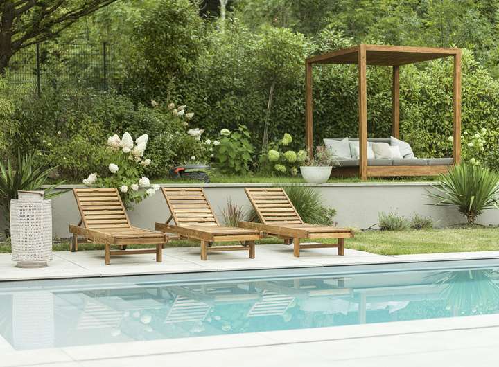 _großzügiger Garten im angelegten L-Format mit verschiedenen Liege- und Sitzmöglichkeiten lädt zum Verweilen zu allen Tageszeiten ein.