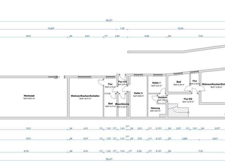 Das Erdgeschoss ergänzt das Ensemble um eine zusätzliche Waschküche, zwei Kellerräume und eine geräumige Werkstatt mit ca. 44 m², welche separat vermietet werden kann.
