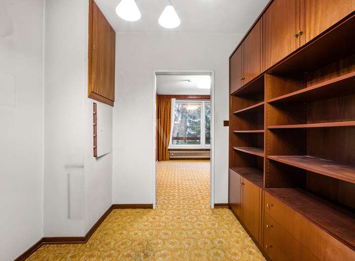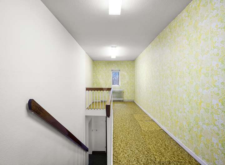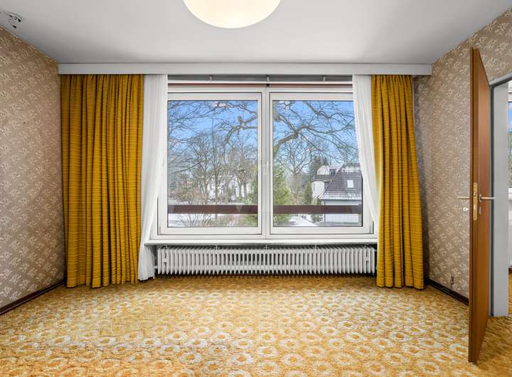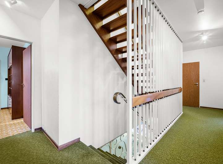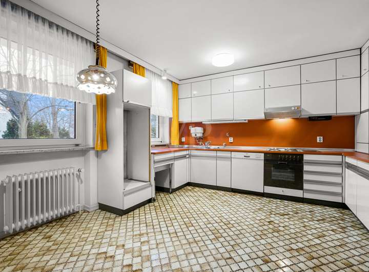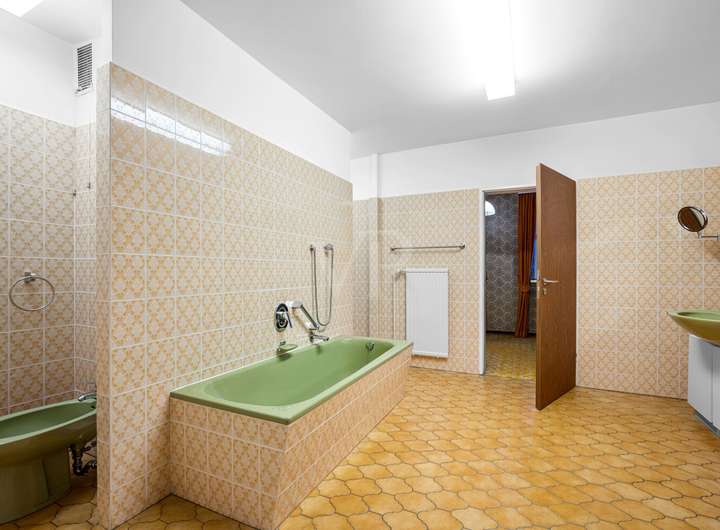 Der ursprüngliche Charakter der 1970er-Jahre ist im gesamten Haus präsent und verleiht der Immobilie ihre besondere Identität. Stilprägende Details wie originale Horn-Lichtschalter sowie farblich akzentuierte, zeittypische Fliesen in den Duschbädern unterstreichen den authentischen architektonischen Anspruch.
