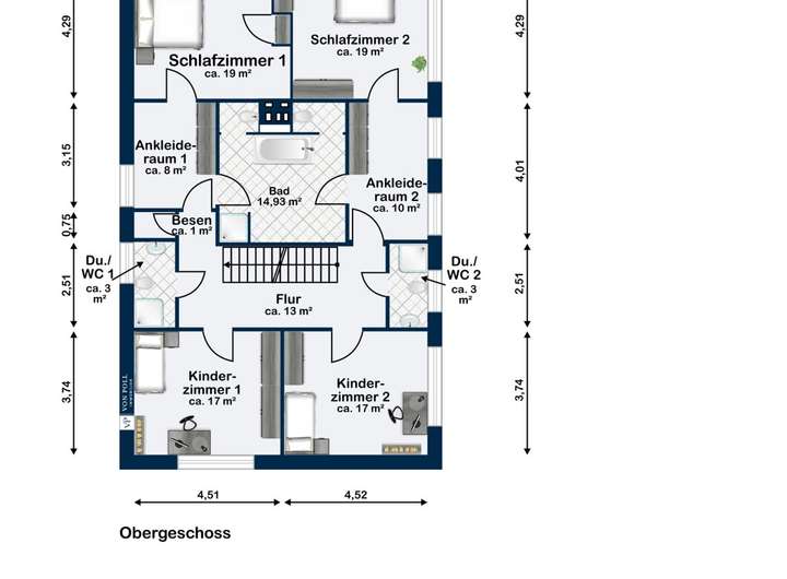 Im Obergeschoss setzt sich die klare, architektonische Struktur fort. Zwei großzügige Kinder- oder Gästezimmer werden durch jeweils ein Duschbad an den Enden des Flures ergänzt. Darüber hinaus verfügt die Etage über zwei Elternschlafzimmer, die jeweils über ein eigenes Vorzimmer verfügen – ideal als Ankleide. Von beiden Vorzimmern gelangt man in ein gemeinsames Bad en Suite mit Dusche und Badewanne.