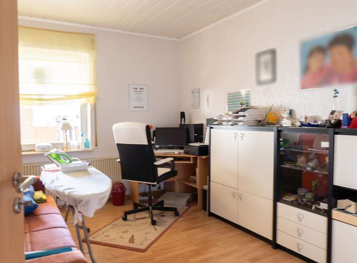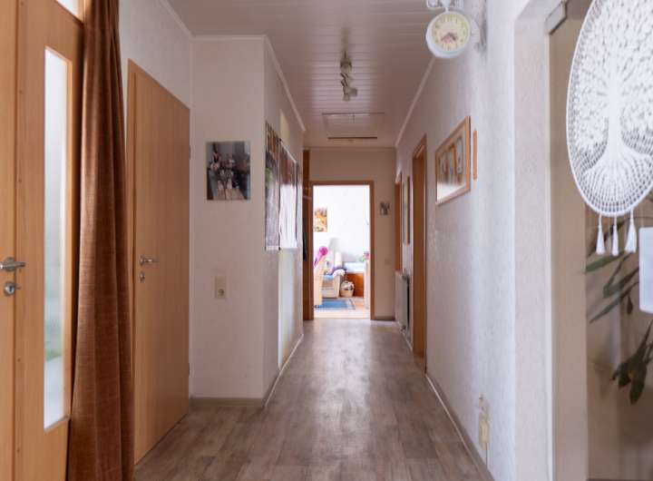 Der Bungalow besticht durch seine durchdachte Aufteilung, die jedem Mitglied der Familie Raum zur Entfaltung bietet. Das großzügige Schlafzimmer ist ein harmonischer Rückzugsort, während zwei lichtdurchflutete Kinderzimmer ausreichend Platz zum Spielen und Lernen bieten. Ein gut ausgestattetes Badezimmer sowie ein praktisches Gäste-WC runden das Angebot ab und gewährleisten Komfort für die gesamte Familie. Der zentrale Flur verbindet alle Wohnräume und schafft eine angenehme Atmosphäre, die zum Verweilen einlädt.