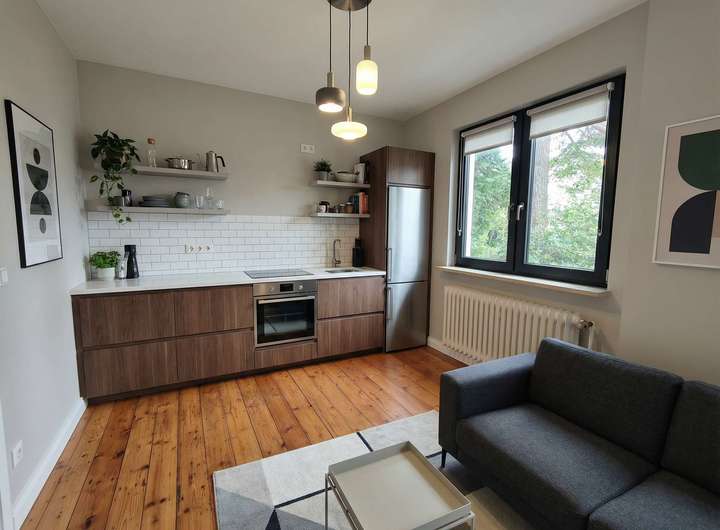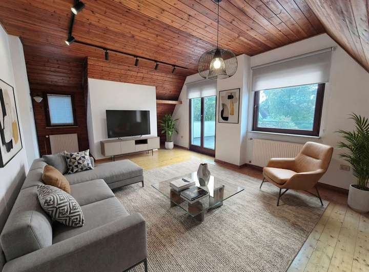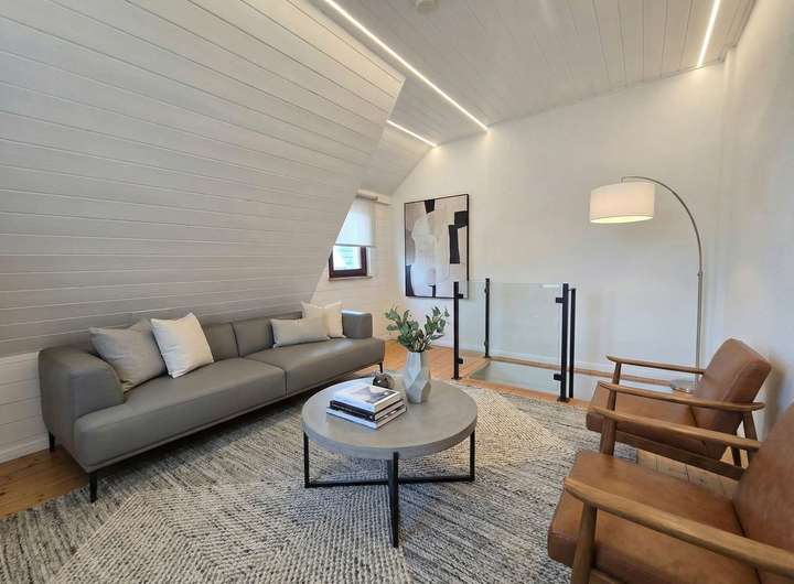 Der separate Wohnbereich (ca. 40m²) verfügt ebenfalls über schöne Dielenböden und viele Fenster. Über einen Flur erreicht man den hellen und offenen Küchen- und Wohnbereich. Auch ein vollausgestattetes Duschbad befindet sich hier. Eine Wendeltreppe führt Sie zudem vom Wohnzimmer in das Obergeschoss, in dem sich das Schlafzimmer des Wohnbereichs befindet.