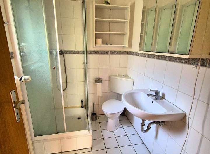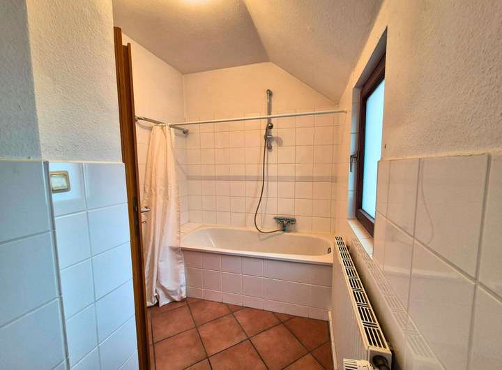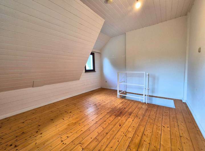 Das Erdgeschoss des Hauses verfügt in der Hauptwohnung (ca. 90m²) über eine Küche mit Gartenzugang, einem Wohn- und Esszimmer sowie einem Gäste-Bad mit Dusche. Das Wohn- und Esszimmer ist mit schönen, klassischen Holzdielen ausgelegt. Über eine Treppe gelangt man in das Obergeschoss, in dem sich ein gemütliches Kinderzimmer, ein Vollbad sowie ein größeres Schlafzimmer befinden. Von hier aus gelangt man zudem auf eine Art Dachterrasse mit West- und Gartenausrichtung sowie über eine Einschubtreppe in den trockenen Dachboden des 2016 neu gedeckten & gedämmten Daches.