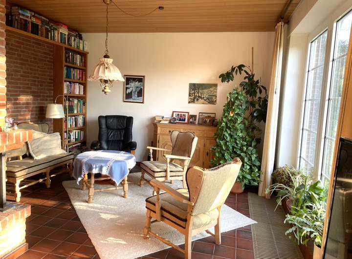 Das große, helle Wohnzimmer mit Kamin bildet den Mittelpunkt des Hauses und sorgt für eine warme, gemütliche Atmosphäre. Vom Esszimmer aus gelangen Sie direkt auf die Terrasse und in den weitläufigen Garten.