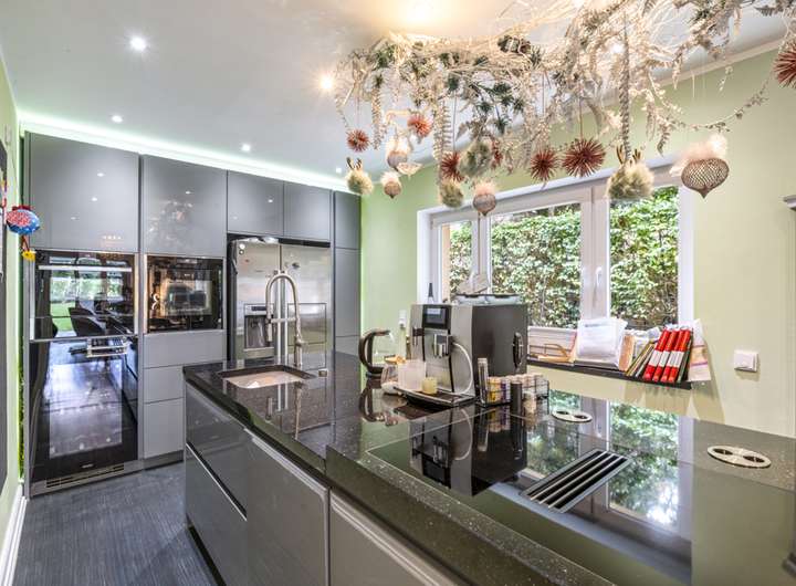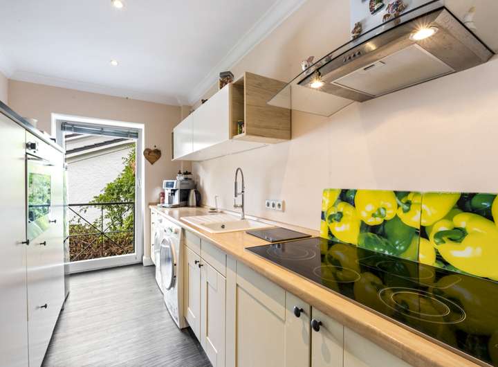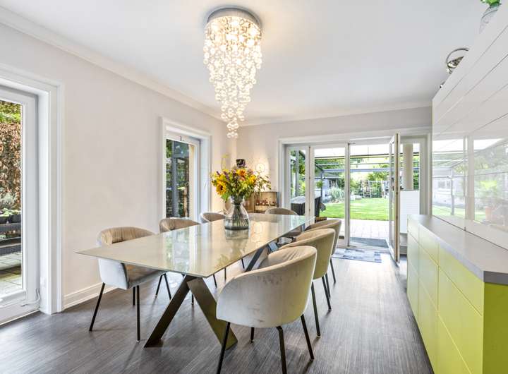 Die moderne Küche ist mit hochwertigen Geräten ausgestattet und bietet ausreichend Platz für kulinarische Kreationen. Angrenzend befindet sich der elegante Essbereich, der sich perfekt für gesellige Abende mit Familie und Freunden eignet. Von hier aus gelangen Sie außerdem auf die über 50 qm große überdachte Terrasse.
