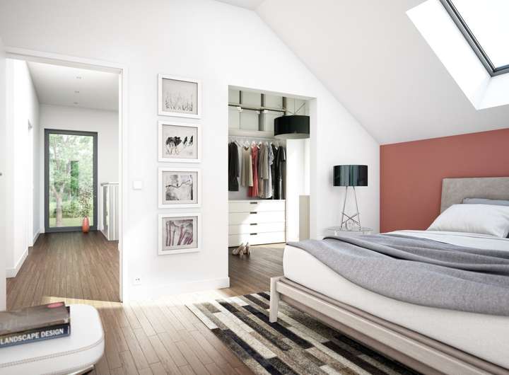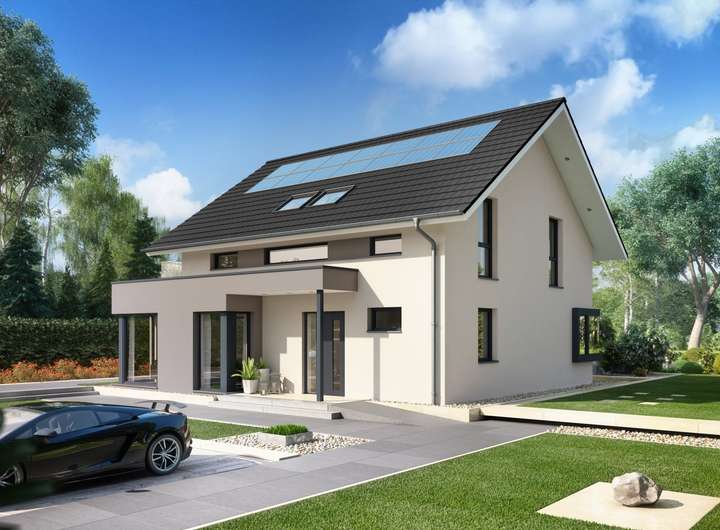 Dieses Einfamilienhaus bringt mit seinen individuellen Gestaltungsmöglichkeiten Schwung ins monotone Siedlungseinerlei. Von außen besticht der Zweigeschosser durch den dezenten Hell-Dunkel-Kontrast und die attraktiven Fensterformate, die von schmalen Lichtbändern über bodentiefe Verglasungen bis hin zum Panorama-Eckfenster reichen. Unterstrichen wird das edle Design durch den Übereck-Erker, der sich auf elegante Weise in eine moderne Eingangsüberdachung verlängert, sowie durch das über beide Etagen reichende Querhaus.