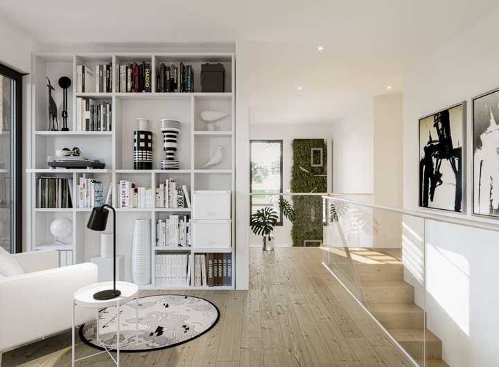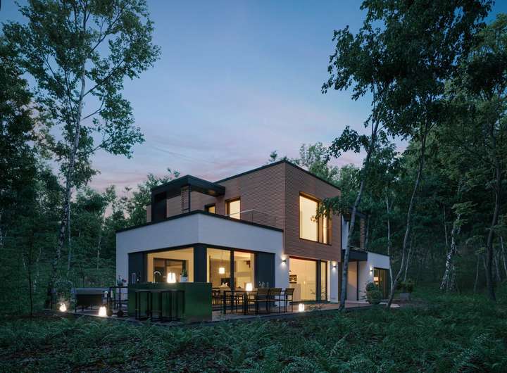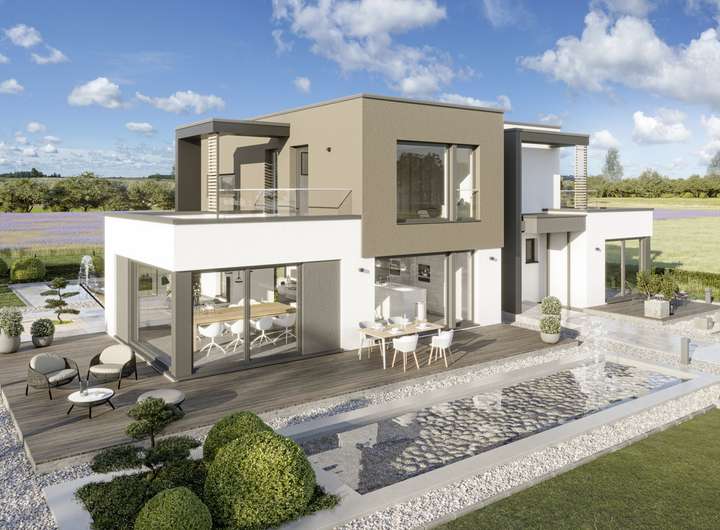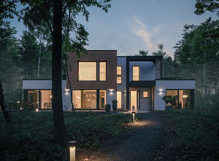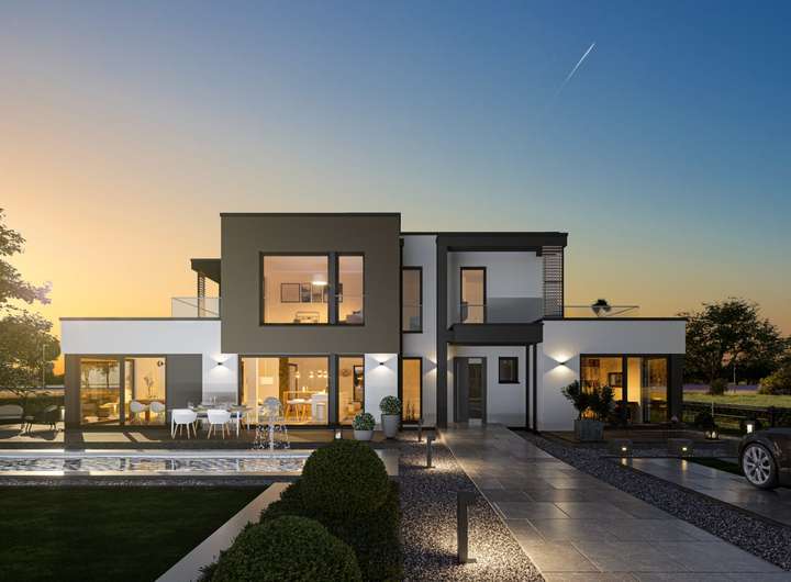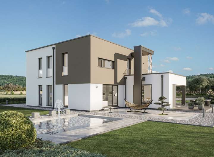 Dieses Haus überzeugt mit einem klar gegliederten Baukörper, Übereck-Erkern und zwei Balkonen, die Sonnenauf- und -untergang erlebbar machen. Die kontrastreiche Fassade in Weiß und Grau - optional mit Holzverschalung - sowie skulpturale Stelen setzen markante architektonische Akzente. Im Inneren treffen ein funktionaler Bürobereich und ein offener, lichtdurchfluteter Wohn-, Ess- und Kochbereich aufeinander. Das Obergeschoss bietet mit zwei Kinderzimmern, großzügigem Elternbereich und Familienbad komfortablen Wohnraum für eine vierköpfige Familie.
