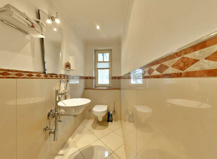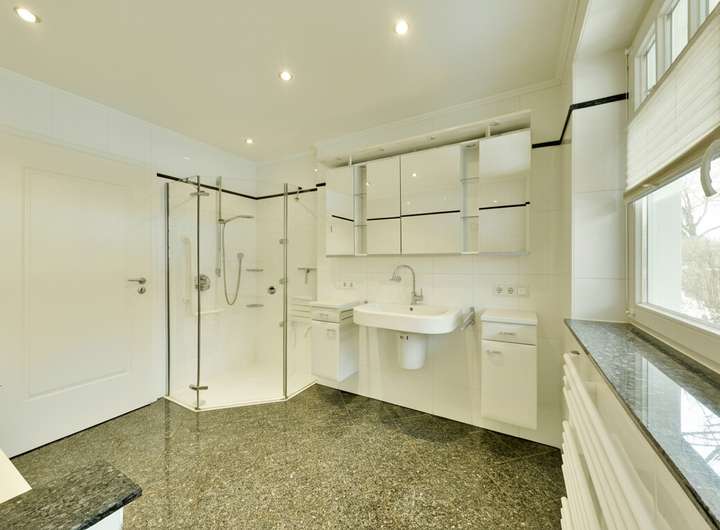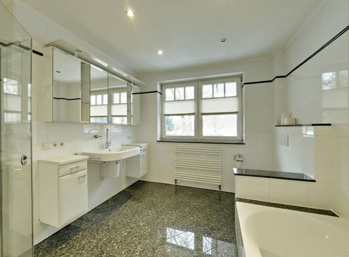 Das Hauptbadezimmer überzeugt mit einem stilvollen Granitboden und einem Konzept, das auf Langlebigkeit und Funktionalität ausgelegt ist. Ein besonderes Highlight ist der elterliche Schlafbereich, der mit einem großzügigen Einbauschrank zusätzlichen Stauraum bietet und so für Ordnung sorgt.