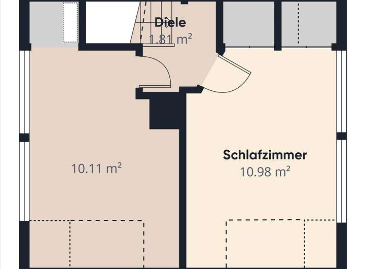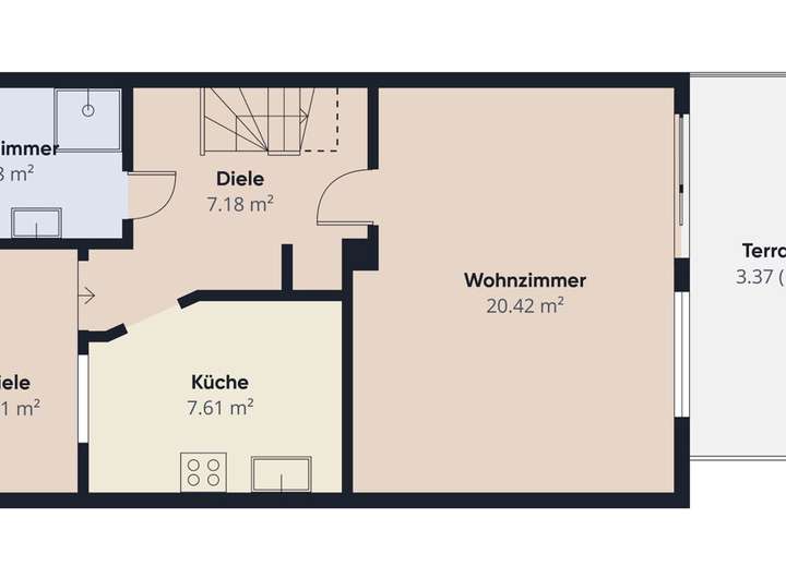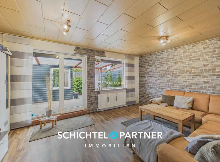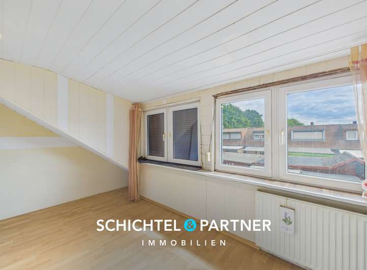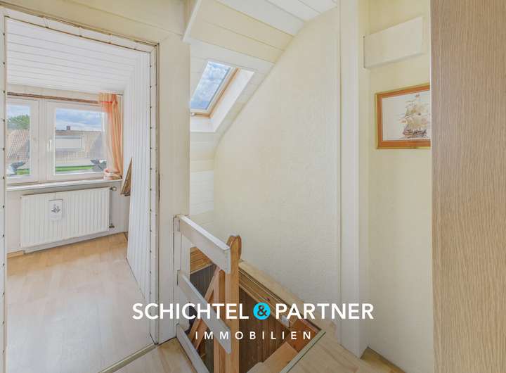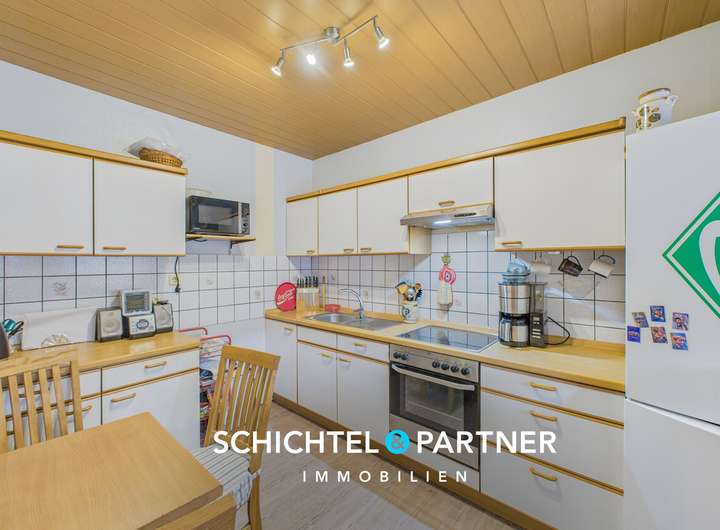 Der Wohnbereich umfasst ein gemütliches Wohnzimmer mit direktem Terrassenzugang, der zudem für viel Lichteinfall sorgt. Die hellen Schlafzimmer überzeugen durch einen optimalen Schnitt und schaffen Raum für eine klare Zimmeraufteilung. In der Küche finden Sie eine robuste Einbauküche inklusive Elektrogeräte, die je nach Bedarf modernisiert oder beibehalten werden können. Im Erdgeschoss ist das Duschbad befindlich, welches über ein Veluxfenster zur Belüftung verfügt.