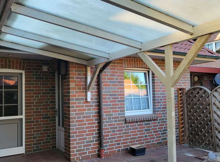 Beim Nebeneingang befindet sich eine überdachte Terrasse – perfekt für entspannte Stunden im Freien.