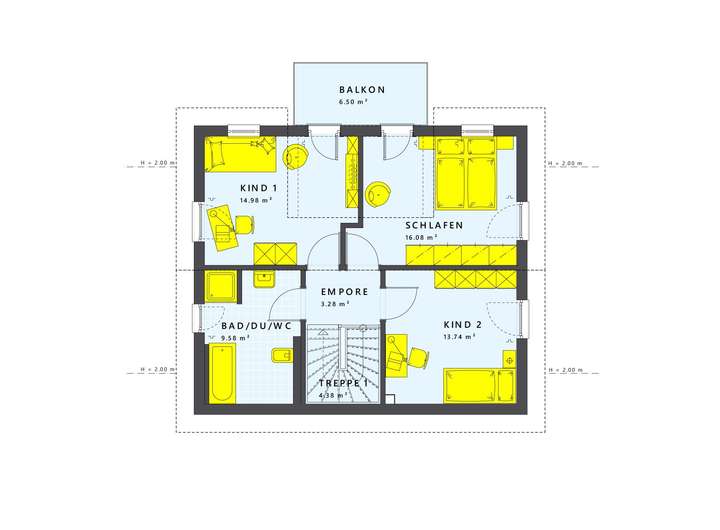 Dieses moderne Einfamilienhaus in Dietzenbach bietet dir auf zwei Etagen ein Gefühl von Zuhause. Mit einer großzügigen Wohnfläche von 125 m² und einem durchdachten Raumkonzept mit vier Zimmern, darunter drei Schlafzimmer und ein Badezimmer, ist es ideal für Familien oder Paare. Das Satteldach mit einer Neigung von 25 Grad sorgt für einen hohen Kniestock von 1,60 m im Obergeschoss, was dir mehr Gestaltungsmöglichkeiten bietet. Zusätzliche Erker oder Giebel erweitern den Wohnraum und schaffen ein einladendes Ambiente.