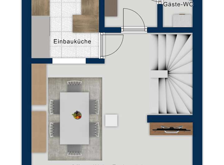 Der Innenraum beeindruckt durch hochwertige Bodenbeläge wie edlen Marmorfliesen, stilvolles Laminat und klassischen Dielenboden auf der Treppe, die dem Haus einen besonderen Charakter verleihen. Die Einbauküche, mit einer Durchreiche ins Wohnzimmer, ist modern gestaltet und lädt zum gemeinsamen Kochen und Genießen ein.