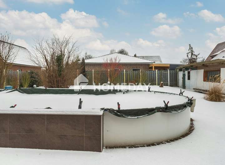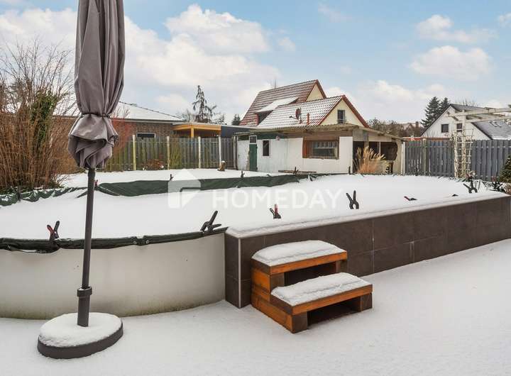 Das Grundstück umfasst rund 700 Quadratmeter und eröffnet vielfältige Nutzungsmöglichkeiten. Garten, Terrasse mit Überdachung und Windschutz sowie ein Außenpool bilden einen Außenbereich, der sowohl Erholung als auch Nutzungsspielraum bietet. Hier entsteht Raum für ruhige Stunden, Bewegung oder ein gutes Buch.