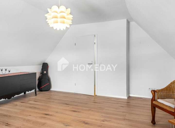 Sichtbare Holzbalken verleihen den Räumen Wärme und Struktur. Der Kaminofen im Eingangsbereich schafft eine einladende Atmosphäre und unterstreicht den wohnlichen Charakter des Hauses. Die Raumaufteilung ist klar und funktional gehalten. Insgesamt stehen fünf Zimmer zur Verfügung, davon vier Schlafzimmer, die flexibel als Rückzugsorte, Kinderzimmer oder Arbeitsräume genutzt werden können. Zwei Badezimmer mit Fenster sowie ein zusätzliches Gäste-WC ergänzen das Raumangebot sinnvoll.