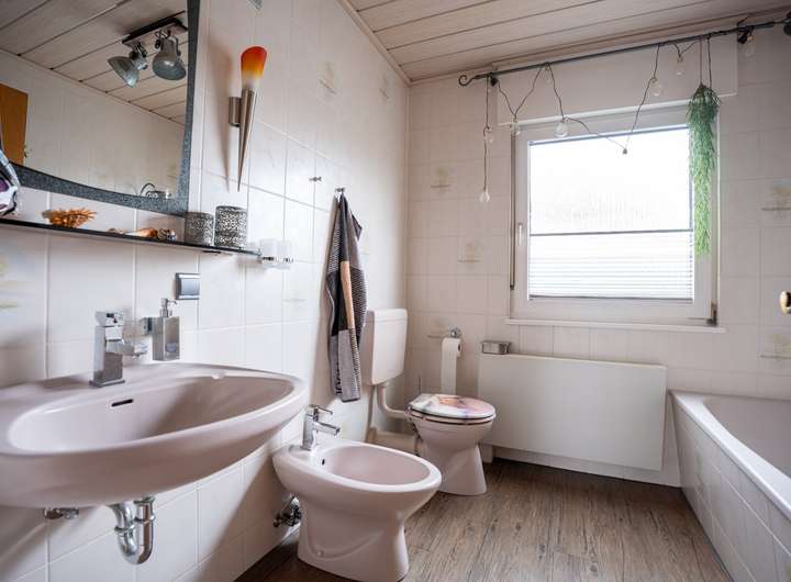 Im Erdgeschoss befindet sich ein Badezimmer mit Badewanne, während das Duschbad im Dachgeschoss bereits erneuert wurde.