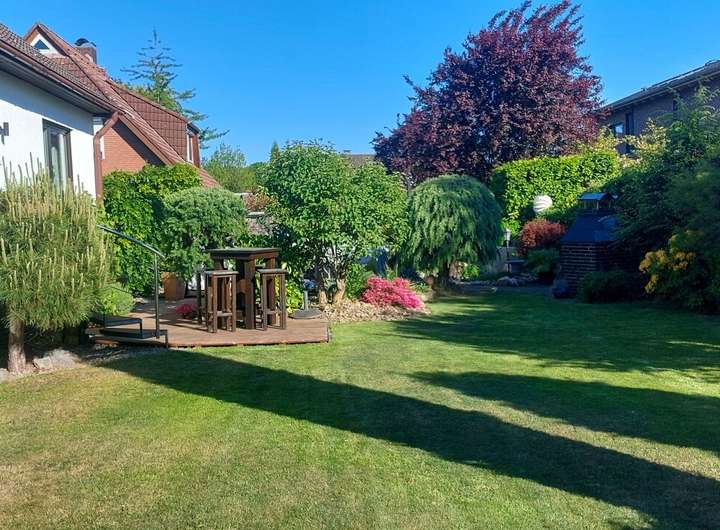 Der Garten überzeugt durch seine schöne Ausrichtung, gepflegte Bepflanzung und eine großzügige Terrasse - ideal für entspannte Stunden im Freien.