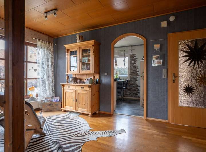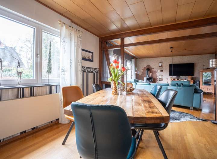 Das Haus verfügt über einen großzügigen Erdgeschossbereich, ein nachträglich ausgebautes Dachgeschoss sowie einen massiven Vollkeller. Der offen gestaltete Wohn- und Essbereich bildet das Herzstück des Hauses und wurde nachträglich mit einem Kaminofen ausgestattet.