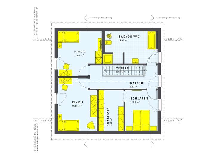 Du hast Wünsche. Du hast Ideen. Die setzt du um. In deinem SUNSHINE-Haus. Der Grundriss ganz nach deinem Geschmack. Du entscheidest. Und da machst du alles so, dass du und jeder in deiner Familie sich wohlfühlt. Denn jeder hat den Platz, den er braucht: Ein offener Gemeinschaftsbereich im Erdgeschoss. Ruhe- und Rückzugszonen oben. Dazu ein wenig Extra-Platz als drittes Kinderzimmer, Büro, Gästezimmer, Abstellraum. Es ist dein Zuhause. Mach es so, wie du willst.