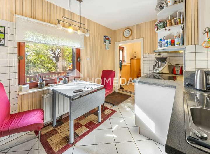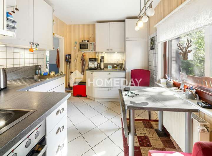 Die Ausstattung ist solide und gepflegt: Böden aus Fliesen, Laminat und Auslegware prägen das Ambiente, während doppelt verglaste Holzfenster und eine Öl-Zentralheizung aus dem Jahr 2012 für verlässliche Funktionalität sorgen. Die Heizungsanlagen werden regelmäßig durch eine Fachfirma gewartet. Eine gepflegte Einbauküche ergänzt den Wohnkomfort. Eine Solaranlage speist zusätzlich Strom ins Netz ein, der vergütet wird.