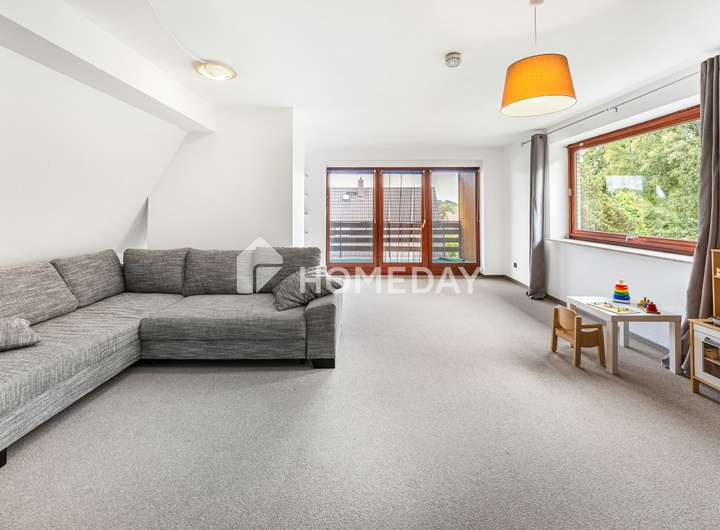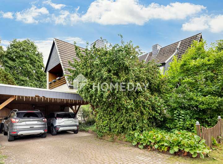 Besonders reizvoll sind die Außenbereiche. Die Terrasse mit Nord-Ausrichtung lädt an warmen Sommertagen zum entspannten Verweilen ein. Die Loggia im Dachgeschoss mit Nord-West-Ausrichtung schenkt dagegen herrliche Abendstimmungen – ein wunderbarer Platz, um den Sonnenuntergang bei einem guten Buch zu genießen. Der große Garten rundet das Angebot ab und eröffnet vielfältige Gestaltungsmöglichkeiten. Für die Pflege des Gartens steht ein Mähroboter zur Verfügung. Für Fahrzeuge stehen insgesamt 4 Stellplätze zur Verfügung, davon 2 geschützt unter einem Carport. Ein Keller bietet zusätzlichen Stauraum und Nutzungsmöglichkeiten.