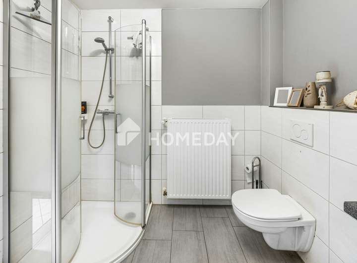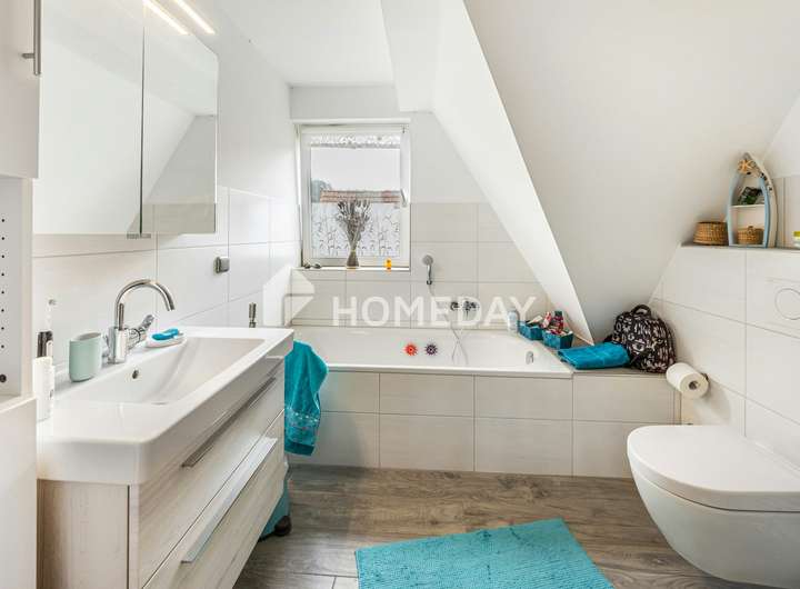 Der Grundriss ist klar gegliedert: Sechs Zimmer schaffen Raum für individuelle Wohnkonzepte – von großzügigen Wohnzimmern über vier Schlafzimmer bis hin zu drei gepflegten Bädern mit Dusche, Fenster und Handtuchwärmer. Im Obergeschoss verfügt ein Badezimmer zusätzlich über eine Badewanne. Ein Kachelofen im Erdgeschoss sorgt für besondere Behaglichkeit und unterstreicht den wohnlichen Charakter. Praktisch ist zudem die separate Gästetoilette im Erdgeschoss, die den Alltag erleichtert. Ein Hauswirtschaftsraum im Erdgeschoss ergänzt die Nutzflächen sinnvoll.