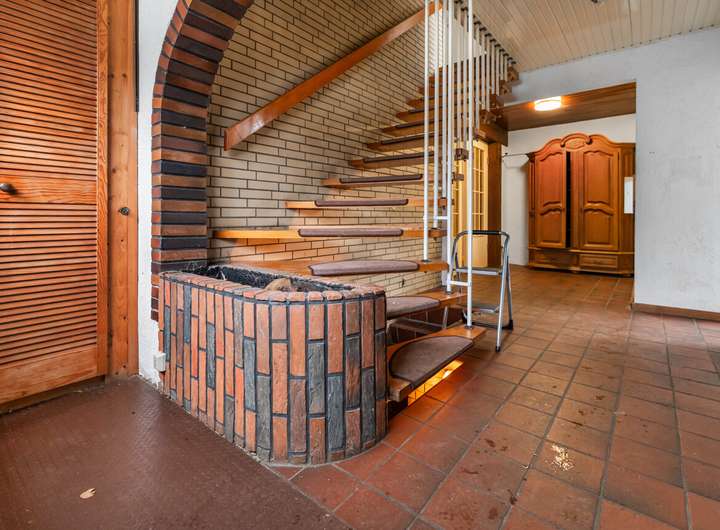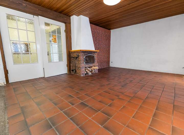 Das Erdgeschoss empfängt Sie mit einem zentralen Flur, von dem aus alle Räume bequem erreichbar sind. Herzstück dieser Ebene ist das großzügige Wohn- und Esszimmer mit direktem Zugang zur sonnigen Terrasse. Ein vorhandener Kamin verleiht dem Raum eine besondere Wohnatmosphäre. Ergänzt wird das Raumangebot durch die Küche sowie ein Gäste-WC mit Dusche.