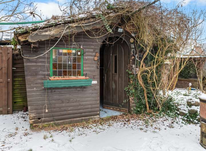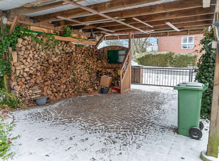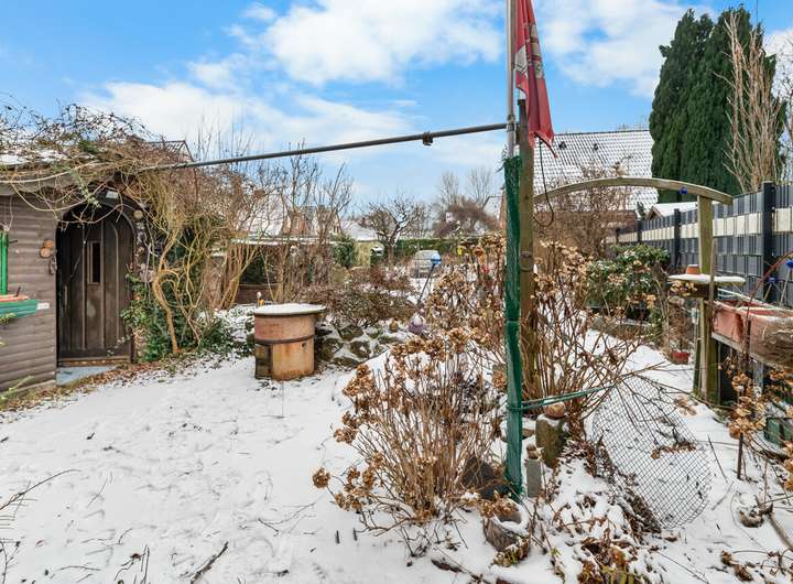 Der Außenbereich lädt mit einer überdachten Terrasse und einem gepflegten Garten zum Verweilen ein. Ein Gartenhaus rundet das Angebot ab.