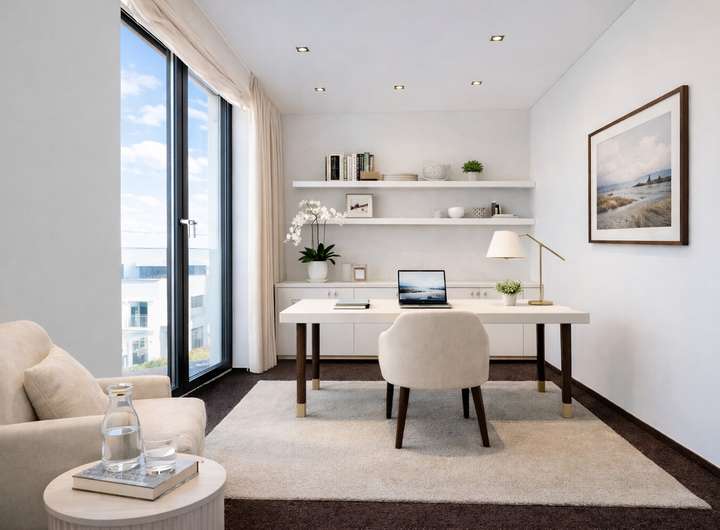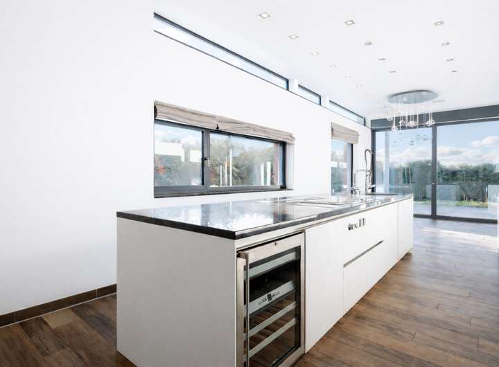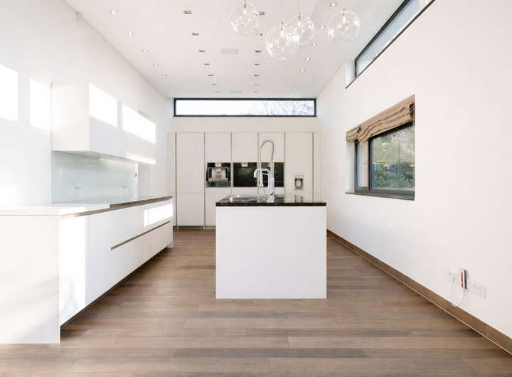 Grifflose, elegante Schrankeinbauten im gesamten Haus sowie bodentiefe Fenster, die vom Boden bis zur Decke reichen, unterstützen das helle und großzügige Raumkonzept mit hohen Decken.
