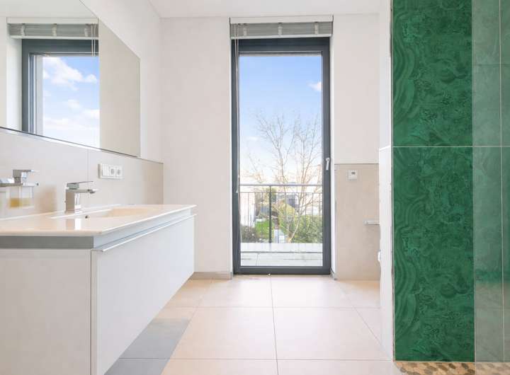 Das Obergeschoss beherbergt zwei weitere großzügige Suiten jeweils mit eigener Ankleide und en Suite Tageslichtbädern. Beide Zimmer führen zu einem circa 13 m² großen Balkon. Ein drittes Zimmer ließe sich leicht realisieren. Zudem befindet sich der Hauswirtschaftsraum auf dieser Ebene.