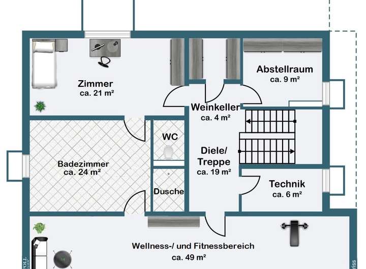 - Vorgesehener Saunabereich mit Ruhe-, Wellness- und Fitnessbereich