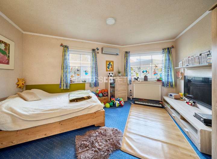 Bei der angebotenen Immobilie handelt es sich um einen gepflegten Bungalow mit einer Wohnfläche von ca. 123 m². Das Haus wurde im Jahr 2001 errichtet und befindet sich auf einem großzügigen, insgesamt ca. 1.800 m² großen Grundstück. Der Bungalow bildet mit den vier Nachbarhäusern eine Gemeinschaft. Der durchdachte Grundriss sorgt für komfortables Wohnen auf einer Ebene. Vom zentralen Flur aus sind alle Räume direkt erreichbar, was eine optimale Nutzung der Wohnfläche ermöglicht. Insgesamt verfügt das Haus über fünf Zimmer, davon vier gut geschnittene Schlafzimmer, die sich ideal für Familien, Gäste oder als Homeoffice eignen. Besonders hervorzuheben ist die technische Ausstattung: Das Dach wurde vor etwa zwei Jahren vollständig neu eingedeckt. Auf dem Dach befindet sich zudem eine Photovoltaikanlage. Die Beheizung des Hauses erfolgt über Strom. Der Keller bietet zusätzliche Nutz- und Abstellflächen und erhöht den praktischen Wohnkomfort. Insgesamt präsentiert sich das Objekt als solide und gut geschnittene Immobilie mit Potenzial in ruhiger Wohnlage.