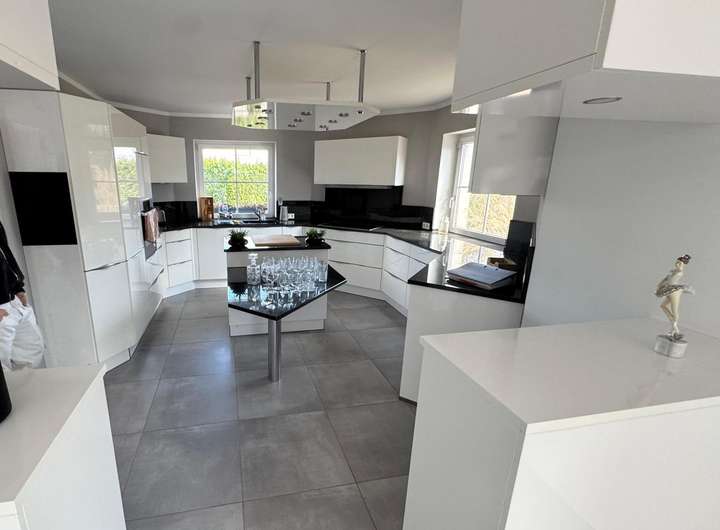 Die elegant integrierte, offene Küche überzeugt durch ihr modernes Nolte-Design und fügt sich nahtlos in das Wohnkonzept ein – ideal für gesellige Abende mit Familie und Freunden.