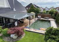 Ein besonderes Highlight ist der eingelassene Natur-Pool im Außenbereich, der das Haus zu einer privaten Wohlfühloase macht und Urlaubsfeeling im eigenen Zuhause garantiert.