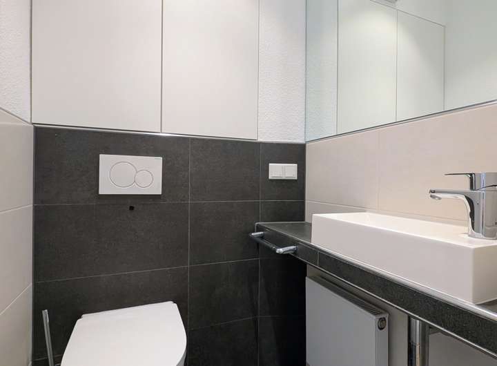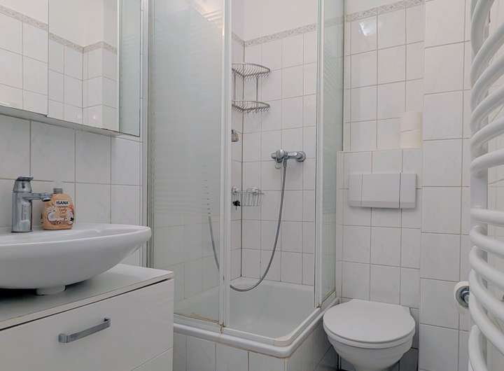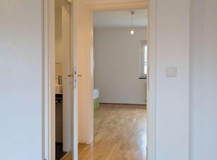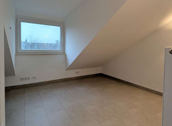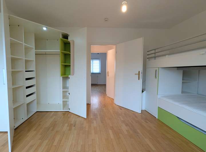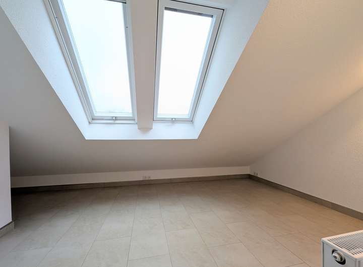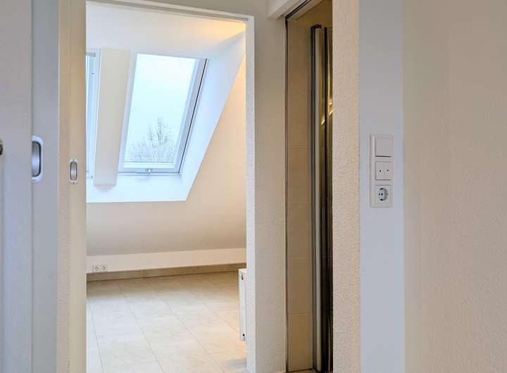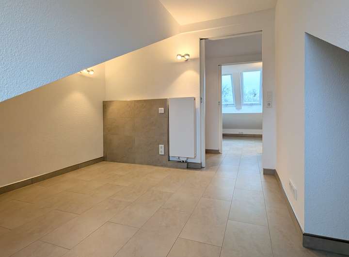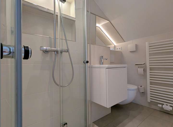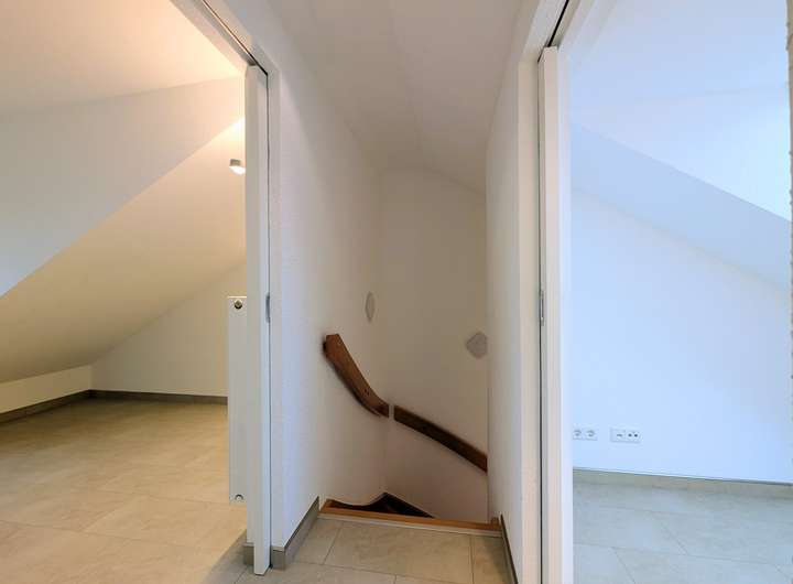 Hier befindet sich auch der Aufgang in das 2018 ausgebaute Dachgeschoss. Zwei Zimmer mit großen Dachflächenfenstern auf der einen bzw. Gaube auf der anderen Seite erweitern das Raumangebot um ca. 29 m² Grundfläche (ca. 24 m² offizielle Wohnfläche). Jeder Zentimeter ist sinnvoll genutzt: Schiebetüren sparen Platz, das moderne Bad mit Dusche und Toilette ist clever eingerichtet, sodass trotz Schräge ausreichend Stehhöhe vorhanden ist und sogar eine Regendusche eingebaut werden konnte. Die verwendeten Materialen sind sorgfältig ausgewählt und durchdacht: elektrische Rollläden an den Fenstern, Fliegenschutzgitter, zahlreiche Steckdosen, moderne Lampen und qualitativ hochwertige Badelemente und Armarturen.
