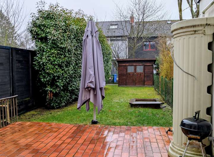 Je nach dem, mit wem Sie einziehen möchten: Hier im Garten können Kinder und Hunde toben, Teenager sich ihre Chill-Out-Lounge gestalten oder Sie mit Ihren Freunden grillen. Für einen zusätzlichen Rückzugs- oder Bastelort bietet das praktische Gartenhäuschen Platz, Strom und ein Dach über dem Kopf. Ein Gartentörchen ermöglicht den Zutritt über die Rückseite des Grundstücks, sodass zum Beispiel Fahrräder verstaut werden können, ohne durch das Haus zu müssen. Und wenn Sie noch eben etwas aus dem Keller holen möchten – der direkte Zugang über die Außentreppe ist praktisch und komfortabel.