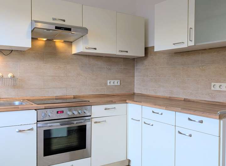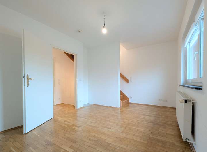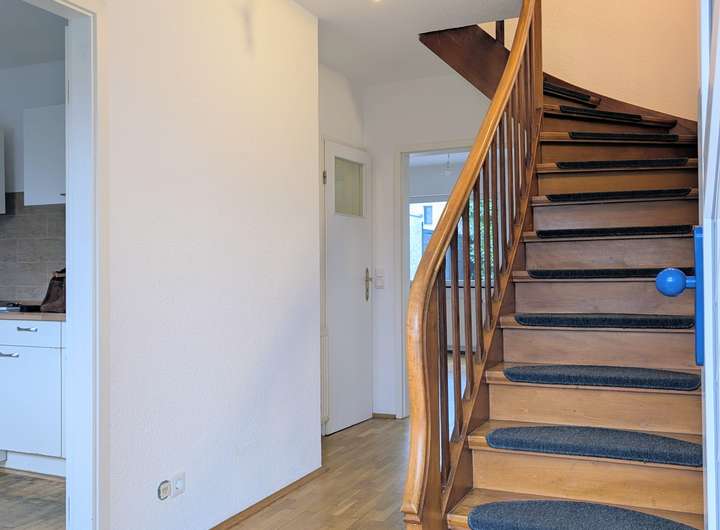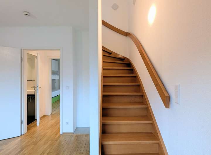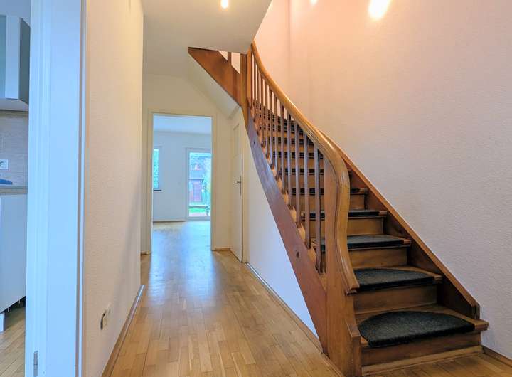 Beim Betreten des Hauses fällt unser Blick gleich auf die schöne, geschwungene Massivholztreppe – wir bleiben aber erstmal im Erdgeschoss und nutzen linkerhand die Garderobennische für Jacken und Schuhe. Unsere Einkäufe legen wir nebenan in der Küche ab, ausreichend Arbeitsfläche ist vorhanden. Vielleicht stellen Sie noch einen kleinen Esstisch und Ihren Kühlschrank dazu – alle anderen Geräte wie Spülmaschine, Herd, Backofen, Dunstabzugshaube und Spüle sind bereits vor Ort.