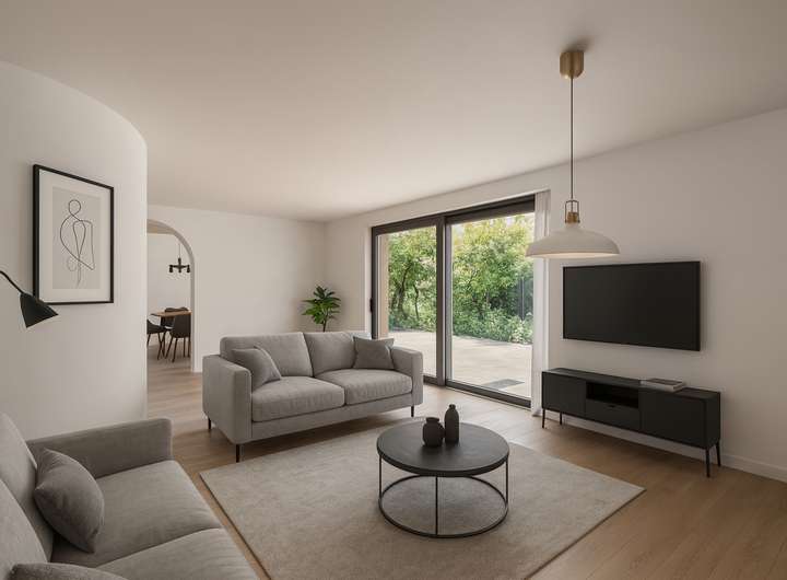 Im Erdgeschoss erwartet Sie ein großzügiger Wohn- und Essbereich mit direktem Zugang zur Terrasse und in den Garten – ideal für Familienleben, Gäste oder entspannte Abende im Grünen. Ergänzt wird diese Ebene durch die Küche sowie ein Gäste-WC.