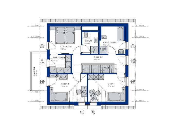 Der Grundriss des EDITION 145 ist optimal auf die Bedürfnisse von Familien abgestimmt. Mit vier Zimmern, darunter drei Schlafzimmer und ein weiteres helles Homeoffice, bietet das Haus ausreichend Raum für individuelle Entfaltung und Rückzug. Die beiden Badezimmer sind strategisch platziert, um sowohl den privaten Schlafbereich als auch den gemeinsamen Bereich im Erdgeschoss zu bedienen. So wird der Alltag für alle Familienmitglieder angenehm und harmonisch gestaltet.