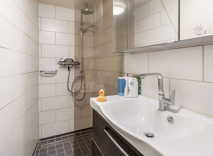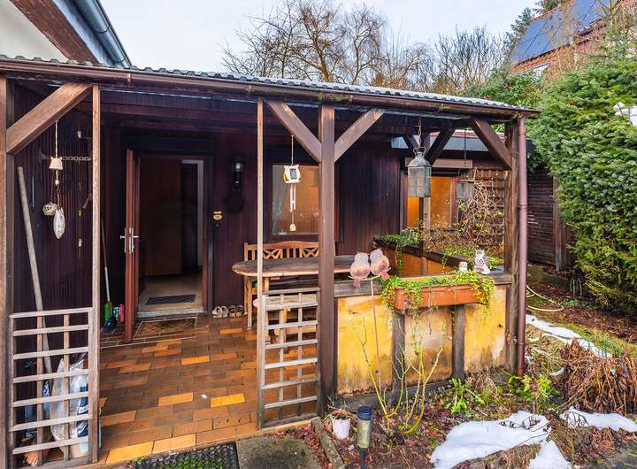 Direkt vor dem Hauseingang befindet sich eine gemütliche Veranda/ überdachte Terrasse, die zu erholsamen Stunden im Freien einlädt. Von hier haben Sie den direkten Zugang in das Haus, wo sich im vorderen Bereich ein Arbeits-/ Gästezimmer und ein modernisiertes Duschbad mit Fenster befinden.