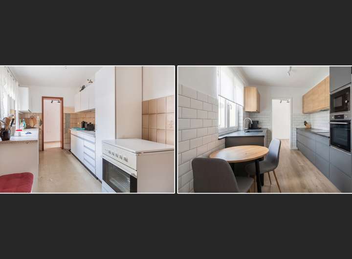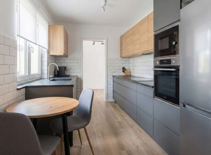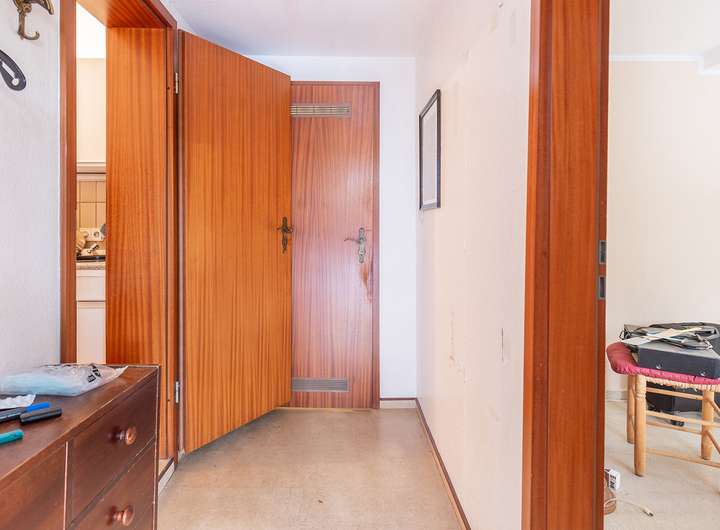 Abgerundet wird der Grundriss optimal durch eine Durchgangsküche, die mit einer einfachen Einbauküche im hellen Dekor und den notwendigen Elektrogeräten ausgestattet ist, sowie ein separates Schlafzimmer, welches direkt an das Wohnzimmer grenzt.
