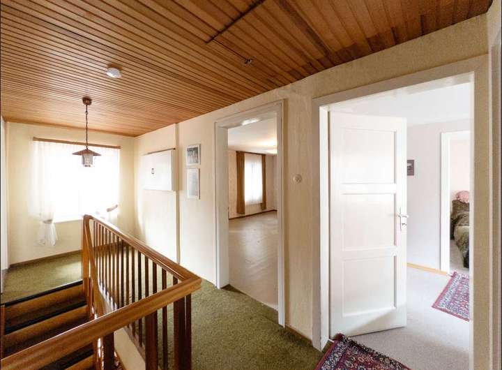Im Hausflur geht es links in einen Wohnbereich mit Küche, Duschbad und großem Wohnzimmer. Auf der gegenüberliegenden Seite haben wir ebenfalls ein großes Wohnzimmer, eine Wohnküche mit einem fensterlosen Raum zur Aufbewahrung und einem Bad. Im Obergeschoss befinden sich 7 weitere Zimmer, wobei es sich bei drei Zimmern um Durchgangszimmer handelt und ein altes WC. Ein Zimmer hat Zugang zur Dachterrasse. Sie verbindet beide Gebäude miteinander, kann aber aktuell nur vom Hauptgebäude betreten werden.