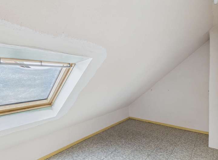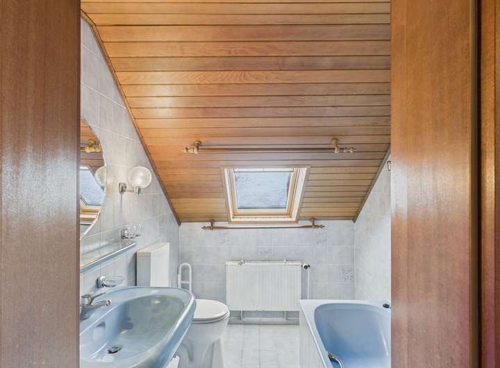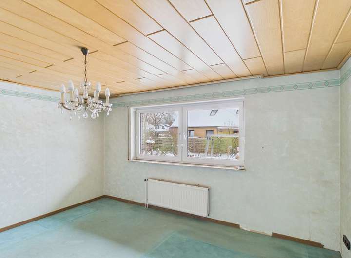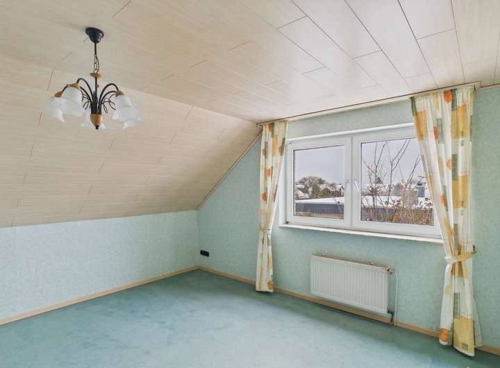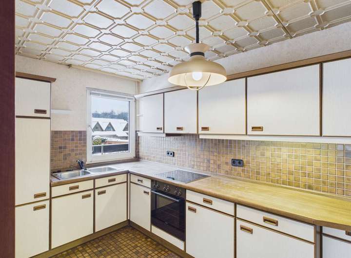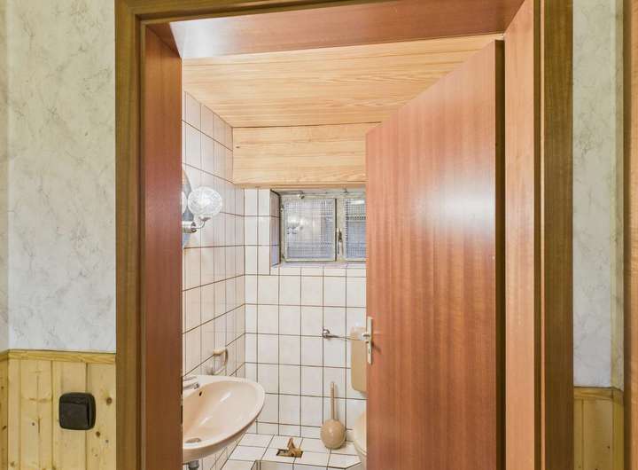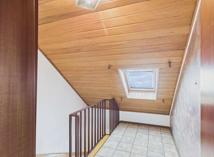 Im Obergeschoss haben wir das große Wohnzimmer mit Loggia, eine Küche mit dahinter befindlichem Abstellraum, zwei Schlafräume und ein Bad aus dem Baujahr. Wenn Sie eine große Familie haben, können Sie aus der Küche ein weiteres Zimmer gestalten.