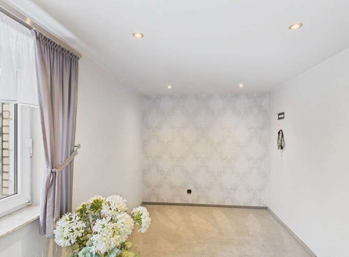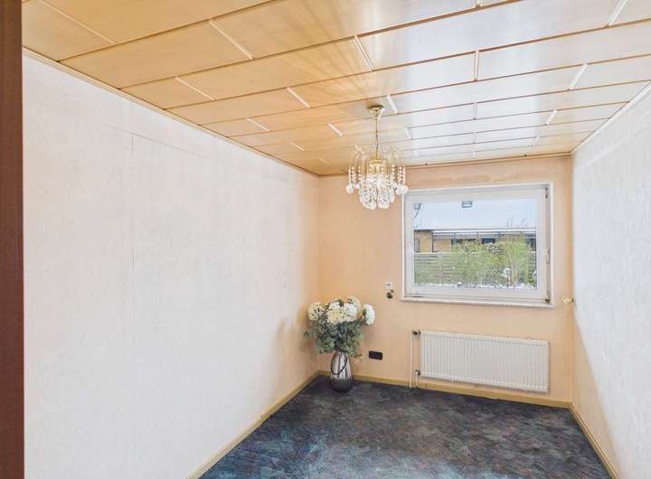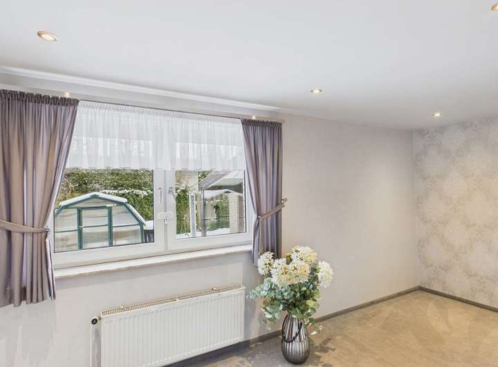 Im Erdgeschoss verbindet der Flur das große Wohnzimmer, die Küche und das Gäste-WC auf der linken Seite mit drei weiteren Schlaf- oder Arbeitsräumen und dem Familienbad. Das große Wohnzimmer hat einen direkten Zugang zur Terrasse mit Blick in den Garten. Von der gut ausgestatteten Küche gibt es eine direkte Verbindung zum Essbereich im Wohnzimmer. Alle Fenster haben Außenjalousien.