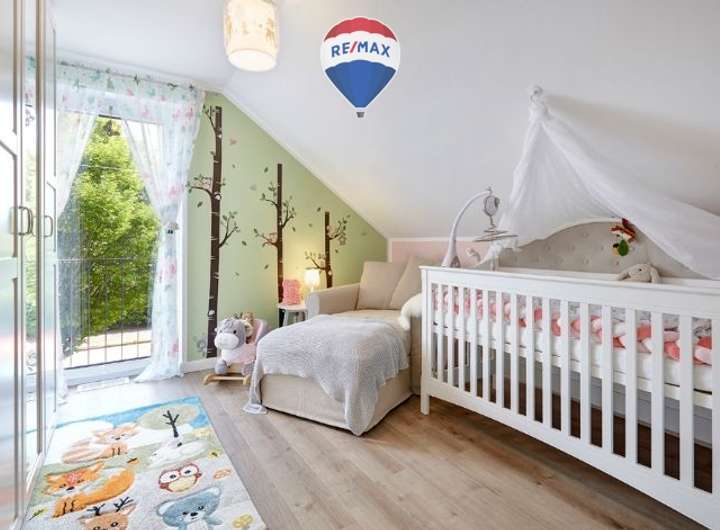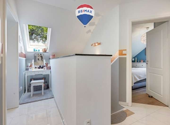 Die Ausstattung des Hauses ist durchweg hochwertig und stilvoll: Marmoroptik-Fliesen aus Feinsteinzeug im Erdgeschoss und Design-Vinyl in Holzoptik im Obergeschoss treffen auf Innenputz in Q3-Qualität mit Malervlies. Bodentiefe Fenster mit abschließbaren Markengriffen, französische Balkone in pulverbeschichtetem Anthrazit sowie Velux-Dachfenster mit Klapp-Schwing-Funktion, Thermo-Schallschutzverglasung, Solarrollladen und Insektenschutz sorgen für ein helles und ruhiges Wohnambiente. Die Doppelflügeltür im Landhausstil verbindet den offenen Wohn- und Essbereich harmonisch miteinander. Im Eingangsbereich wurden eingelassene Schuhabstreiferwannen integriert – ein durchdachtes Detail, das den Alltag erleichtert.