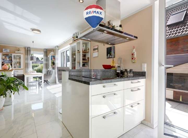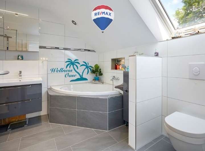 Die moderne, offene Einbauküche der Marke Schüller überzeugt mit einer edlen Granitarbeitsplatte, hochwertigen Markengeräten, einem großzügigen Induktionsfeld und einem automatischen Abluftsystem mit Berbel-Mauerkasten. Das Badezimmer im Obergeschoss bietet exklusive Ausstattung mit einem Rainshower-Duschsystem von Hans Grohe, einem Doppelwaschtisch mit passendem Unterschrank von Villeroy & Boch, hochwertigen Armaturen sowie einer spülrandlosen Toilette – ebenfalls von Villeroy & Boch – ergänzt durch eine diskrete Schamwand als Sichtschutz. Darüber hinaus verfügt die Immobilie über ein großzügiges Badezimmer mit Dusche, Badewanne und WC sowie über ein separates Gäste-WC im Erdgeschoss – ideal für Familien oder Besuch.